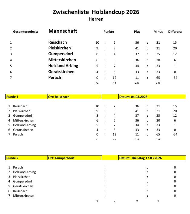 Eine Holzlandcuprunde erstreckt sich immer über 7 Jahre. Jede teilnehmende Mannschaft richtet einmal das Finale aus. In der aktuellen Runde waren bisher schon Mitterskirchen, Gumpersdorf, Pleiskirchen und Reischach die Finalausrichter. Von den restlichen Teilnehmern richtet je nach bestem Tabellenstand einer das Finale aus. D.h. beim Besten in der Tabelle von Geratskirchen, Perach oder Arbing findet das Finale heuer statt. Termin für Finale Damen und Herren ist der 30. April.